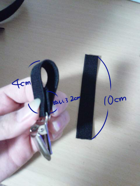残りのゴムを10cmに切って、パチンと止める金具にこのように通します。
